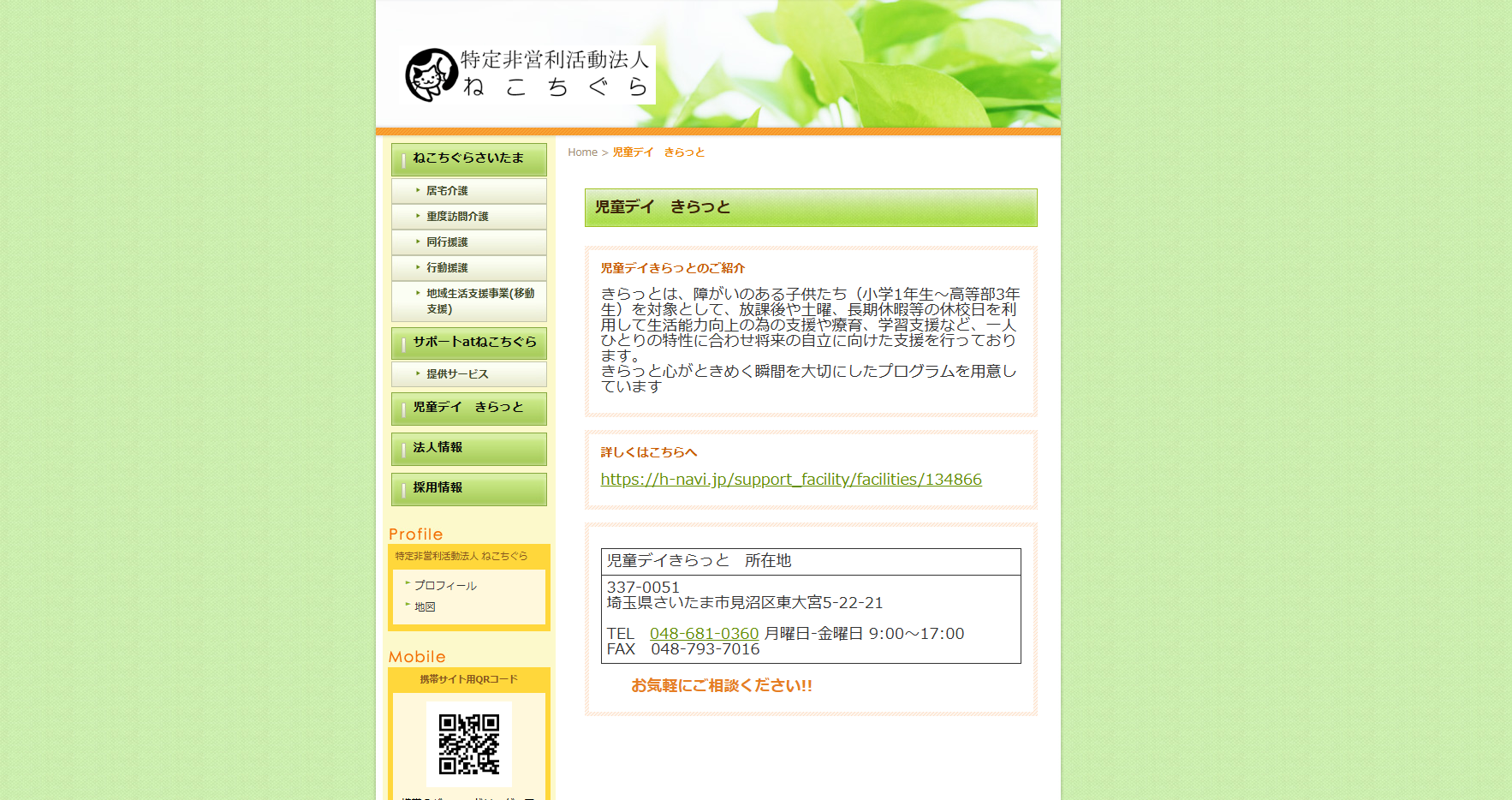 施設紹介ページには、施設の特色やプログラム内容だけでなく、1日の流れの例の記載もあります。在籍児童の障害程度や職員あたりの児童数など気になる情報を網羅しており、安心して見学や体験に勧めるようわかりやすく記載しています。