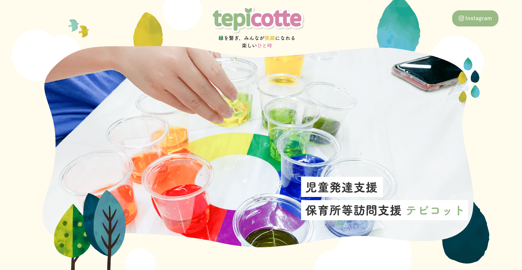 テピコットは、2歳から未就学児を対象とする児童発達支援・保育所等訪問支援施設です。専門スタッフが個々の特性に合わせた支援計画を立て、絵画や造形を中心とした「色彩造形療育」で創造力や表現力を育てます。