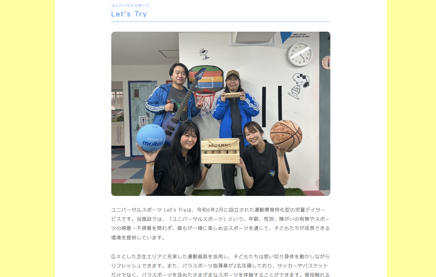 ユニバーサルスポーツlet’stryは、運動療育特化型の放課後デイサービスです。2024年2月に誕生したばかりの施設で、バスケットボールだけでなくサッカーやパラスポーツにも挑戦できます。