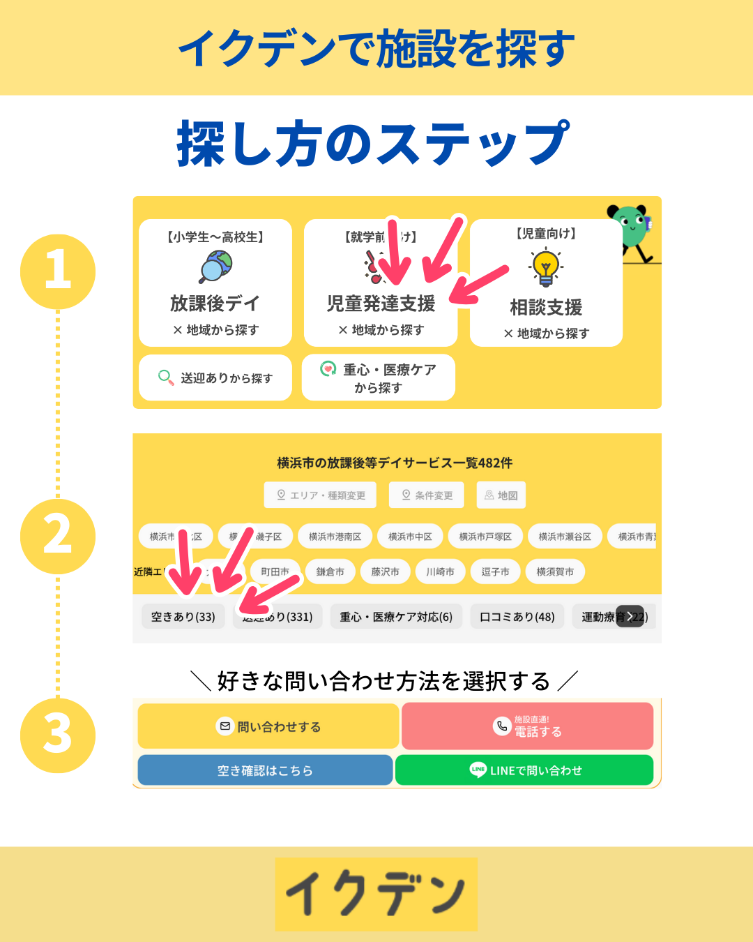 「イクデン」なら、学習支援プログラムを提供している放課後等デイサービスや発達支援施設を、お住まいのエリアから簡単に検索できます。リアルタイムの空き状況やプログラム内容、利用者の口コミも確認できるため、お子さんに合った施設が見つかるでしょう。