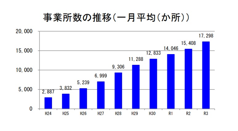 2021年の事業所数は全国で17,298ヶ所となっており、2012年の事業所数が2,887ヶ所であることを踏まえると放課後等デイサービスの数が急増していることは明白です。