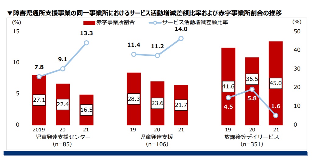 福祉医療機構が実施した調査によると、2021年度の放課後等デイサービスの赤字事業所割合は45.0%に拡大しています。