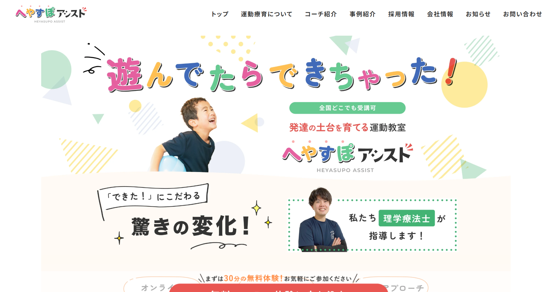 へやすぽアシストは、オンラインで全国から受講できる運動・発達支援サービスです。理学療法士や作業療法士といった専門家が、マンツーマンで指導してくれます。年少から高校生までを対象にした、「体の使い方」「脳と感覚のつながり」に着目し、プログラムを組んでくれるのが魅力です。